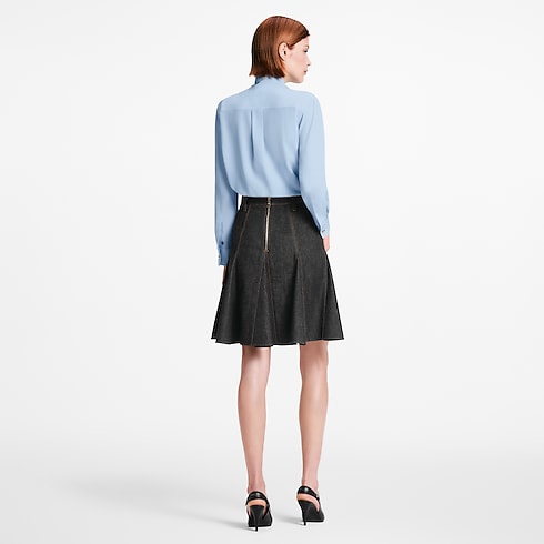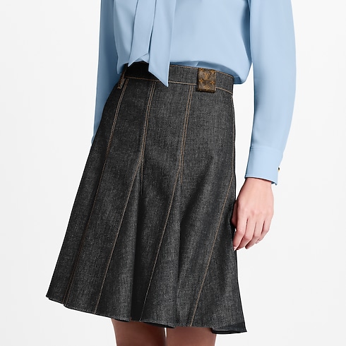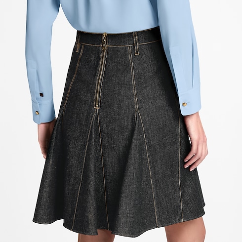 This skirt is made from dark-blue denim with contrasting yellow topstitching highlighting the seams for a timeless, structured look. Godet inserts introduce chic volume to the silhouette, while a Monogram canvas belt loop adds a modern signature to the waistband. Fastened at the back with an exposed zipper.