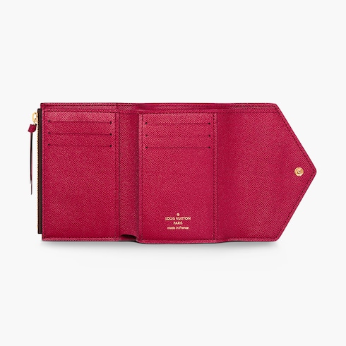 The compact Victorine wallet in Monogram canvas combines femininity and functionality. It opens out to reveal many practical features, including card slots and pockets for bills and coins. Its envelope-style flap is sealed with a press-stud.