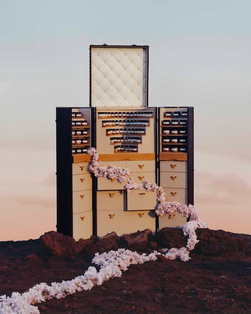 Opening the door to distant horizons, the Perfume Atlas Exclusive Set extends the immersive voyage with a limited edition, featuring an exceptional case and 45 vials of the pure essences evoked in the book — composing Louis Vuitton's iconic perfumes.