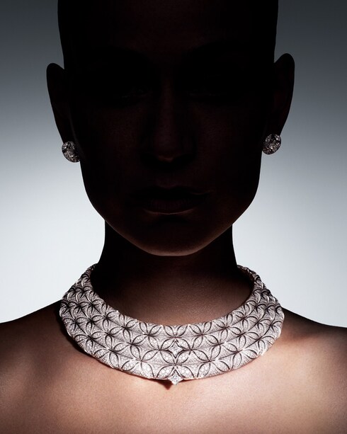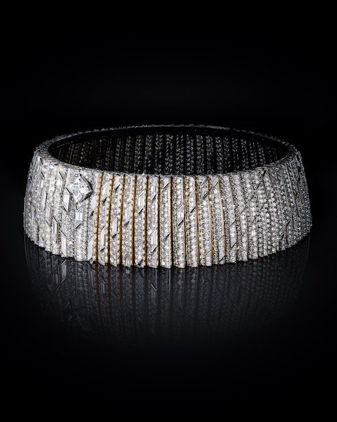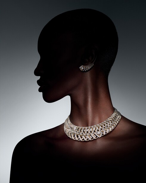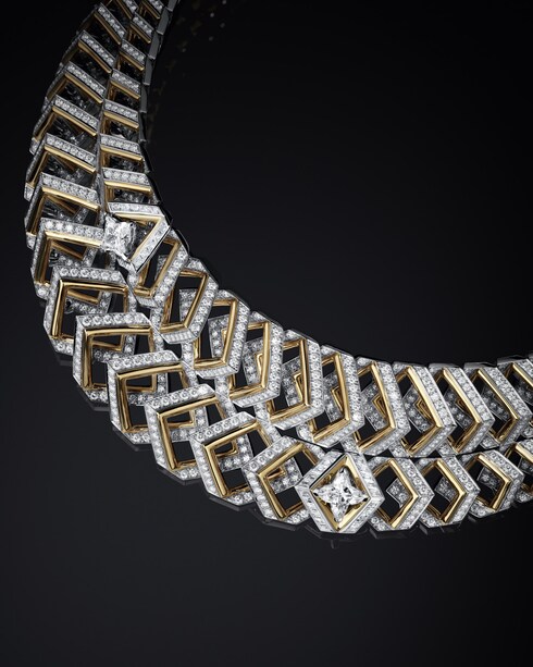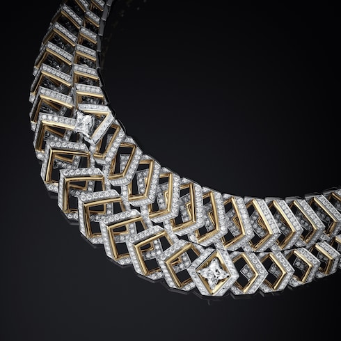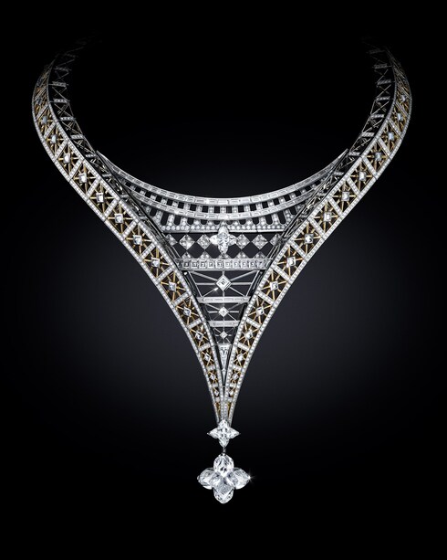 Dynamisme echoes the era’s modern collectivism, evoking the travel phenomenon that propelled Louis Vuitton to the forefront of innovation. A highly structural necklace creates a graphic display of interconnectedness with its precisely aligned links and LV Monogram Star cut diamonds, emphasizing technical mastery through its 3D two-strand chevron motif, while platinum and yellow gold enhance its angular directionality.