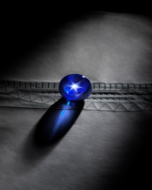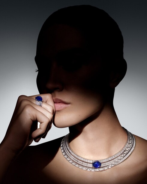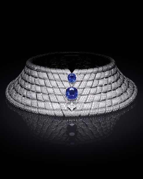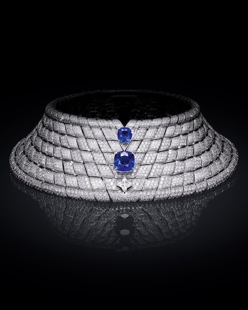 Perception reframes the era's sense of motion and rapid new pace through repeated geometric patterns — realized in mesmerizing mix of diamonds. Unprecedented sapphire gemstones glow with a velvety blue hue, commanding the centerpiece.