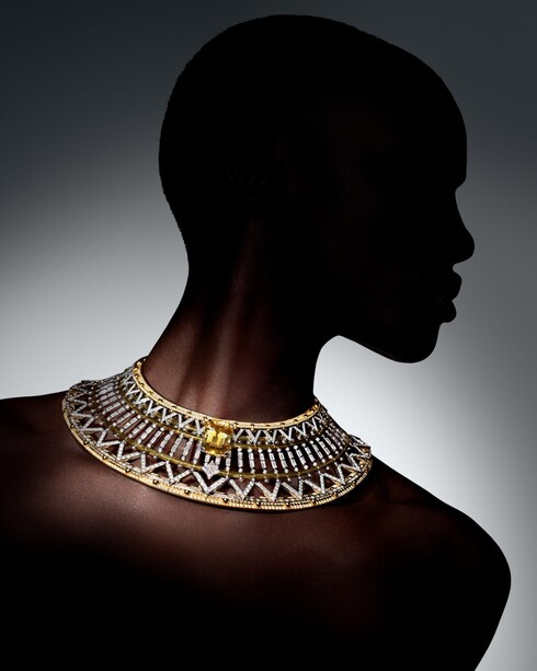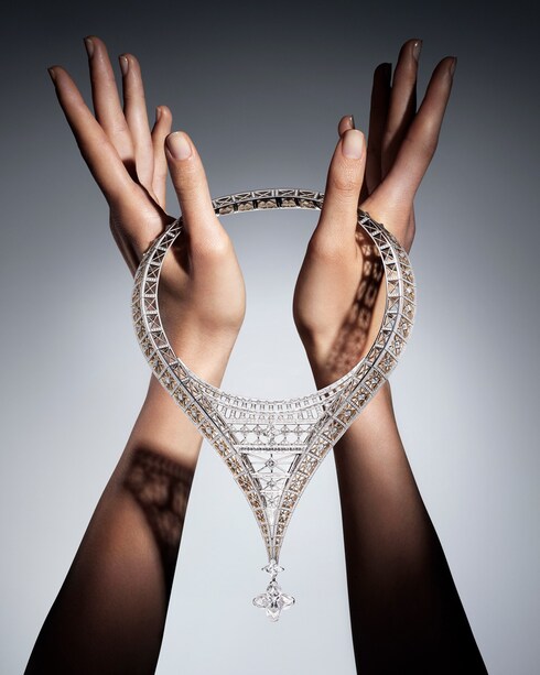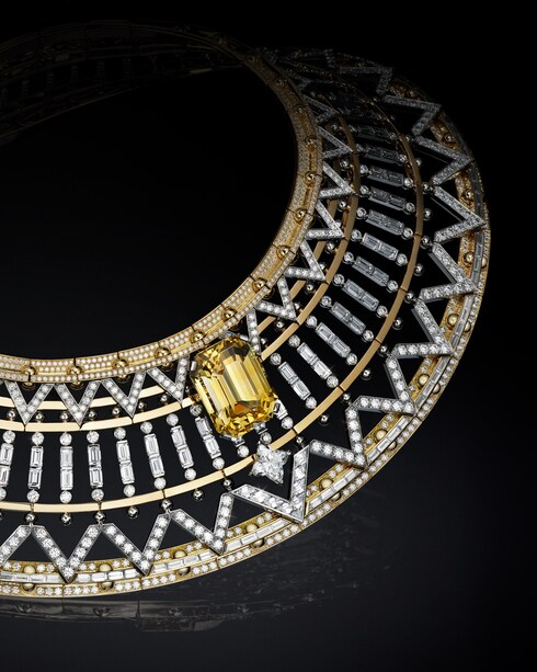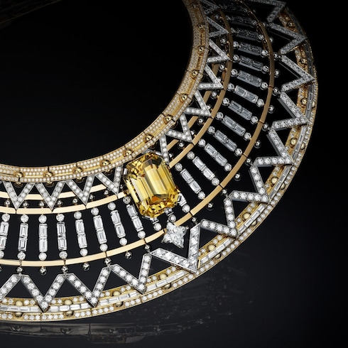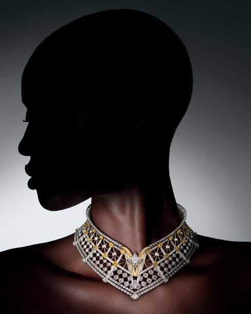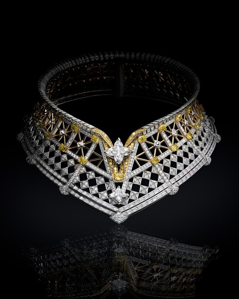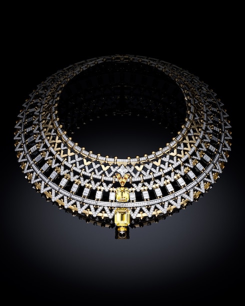 Parisian savoir-faire radiates in Victoire, a breathtaking tribute to artistry and architectural legacy. Featuring a striking layered necklace illuminated by 25 yellow diamonds, it boldly reimagines Louis Vuitton's iconic V-shape with cascading brilliance, embodying heritage craftsmanship and modern elegance.