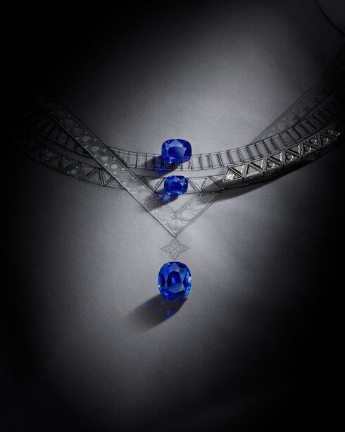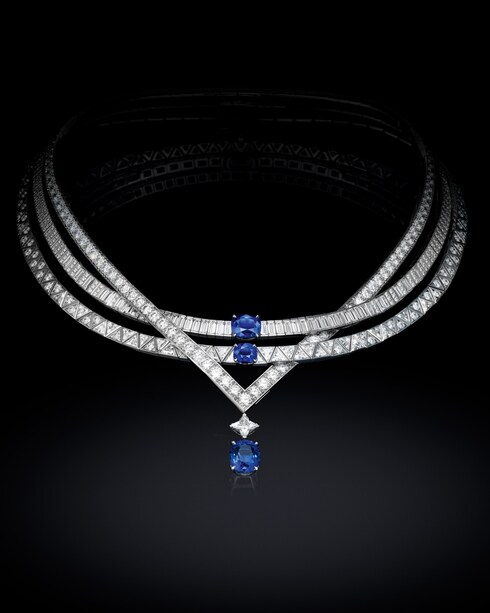 An embodiment of 19th-century scientific advancements in mobility, Gravité's precision unveils a harmonious layered effect of precious stones and metals. Perfectly balanced settings of rectangular, triangular, and round pavé set diamonds magnify the luminous brilliance of a rare assortment of hypnotic sapphires, accentuated by the House's signature V-shape.