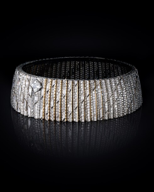 The captivating allure of Paris is personified in Optimisme, unveiled in a play of architectural refinement. Sophisticated and elegant, a bold choker winds around the neck, achieving a fascinating dual tone effect with delicately shaped baguette diamonds among interlocking facades of platinum and yellow gold — a configuration for optimal reflection.
