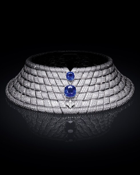 Interlaced V-shaped links are revisited with luxurious rivets reminiscent of the Maison's trunkmaking codes — crafting enveloping pieces, accentuated by opulent golden yellow sapphires.