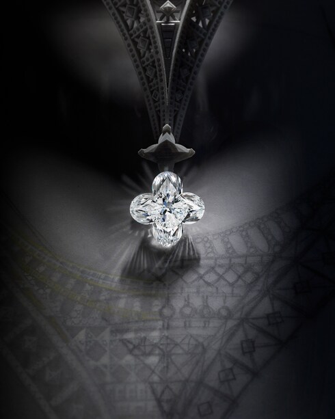 Crafted in the image of the iconic French landmark, Victoire embraces the intricate Eiffel Tower's movement with a unique inverted perspective with a remarkable V-shaped necklace. The exceptional 15.16-carat D IF stone, cut in the shape of the Monogram Flower.