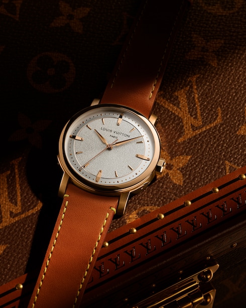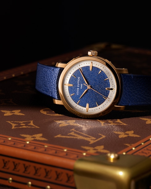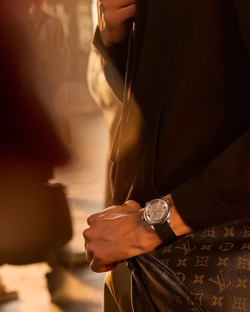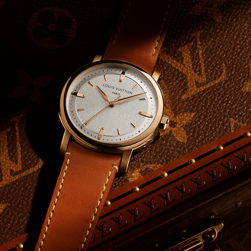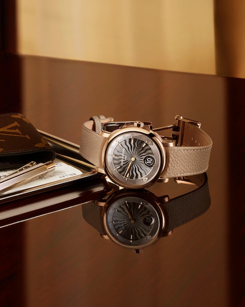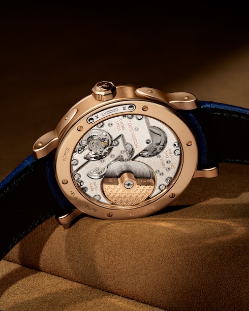 Rich in complexity, the dial reveals gold indexes and studs inspired by the metallic accents and lozine nails of Louis Vuitton's emblematic trunks, while a grained-finish center adds visual texture to select rose gold variations – in an ode to the House's iconic Monogram canvas.