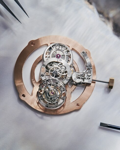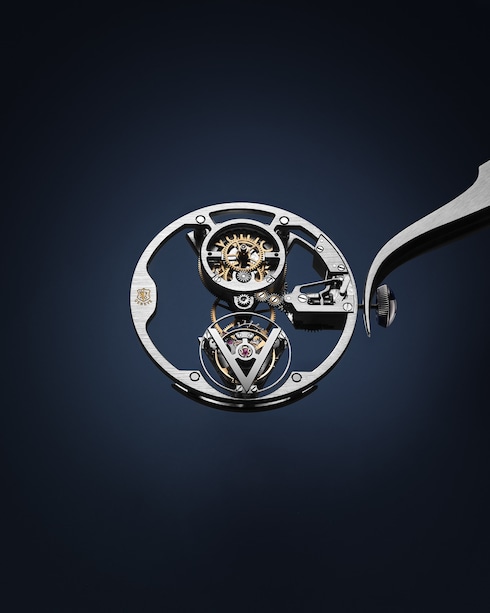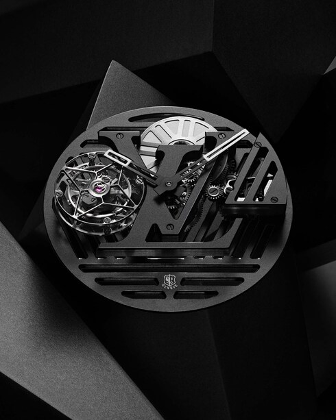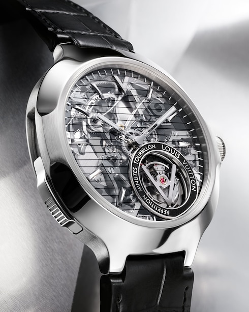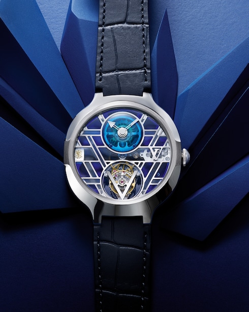 Brought to life in an exclusive collaboration with world-renowned architect Frank Gehry, this one-of-a-kind timepiece boasts one of the most technically complex dial designs La Fabrique du Temps Louis Vuitton has ever created. With over 250 hours of work required for the dial manufacturing, the creation encompasses absolute transparency. Evoking Frank Gehry's elaborate architecture, this expressive glass structure draws the eye to an extraordinary view of the Flying Tourbillon caliber stamped with the Poinçon de Genève seal.