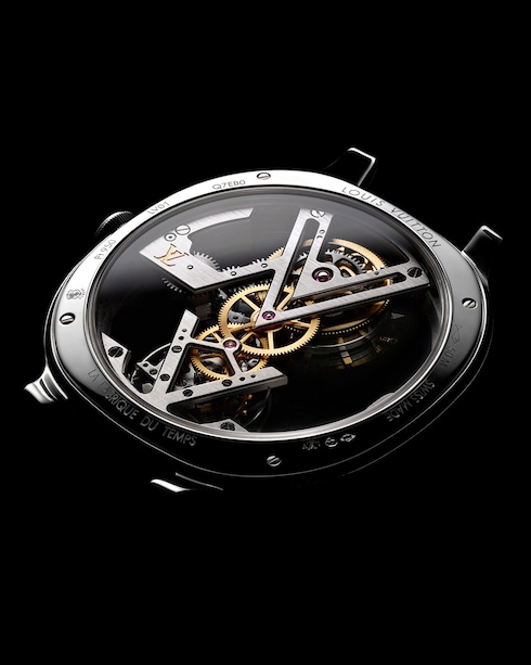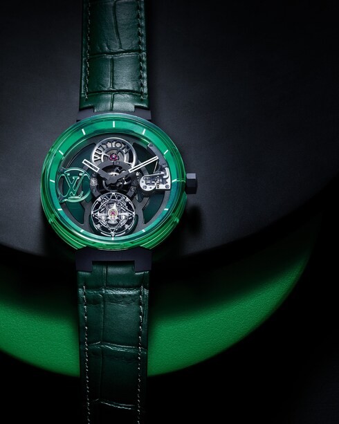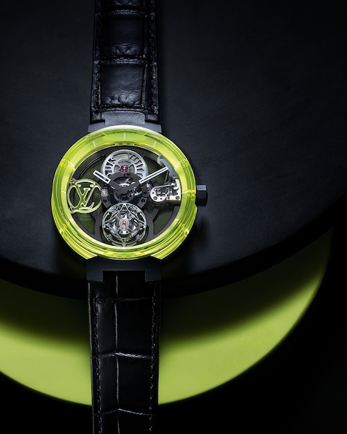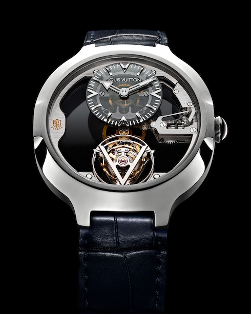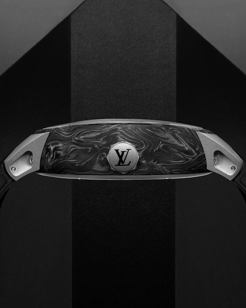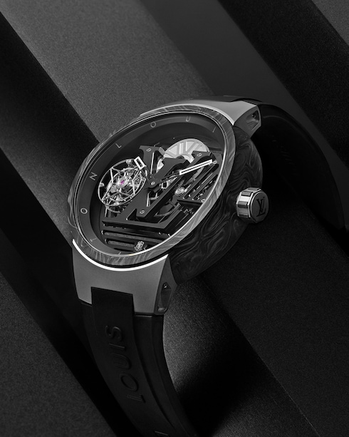 The Tambour Curve Flying Tourbillon Poinçon de Genève is a futuristic, more technical interpretation of Louis Vuitton’s original Tambour watch. With an open construction and animated by a flying tourbillon escapement, this lightweight design is part of a new generation of boldly masculine watches.