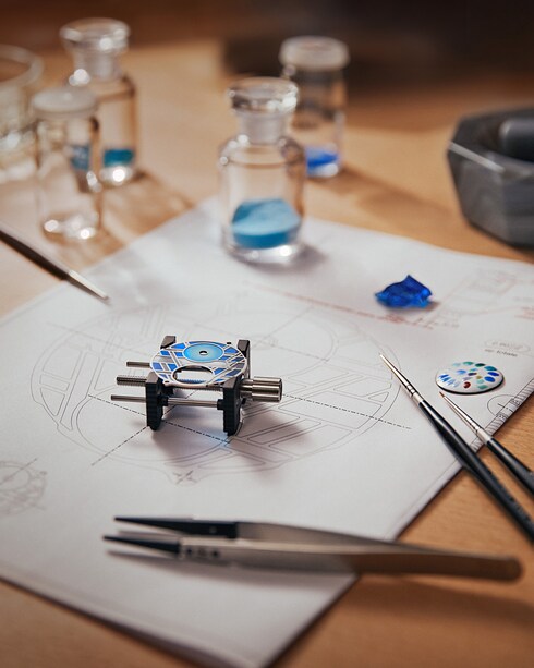 In an embodiment of the encounter between enamels and kiln heat to reveal the brilliance and intensity of colors, enameling is a demanding art that requires highly technical skills to be acquired over several years by the master enamelers of La Fabrique du Temps Louis Vuitton. These include plique-à-jour, with its play of transparency and contrasts, highlighted by a gold cloisonné structure, and paillonné, which magnifies enamel layers with fine flecks of gold leaf.