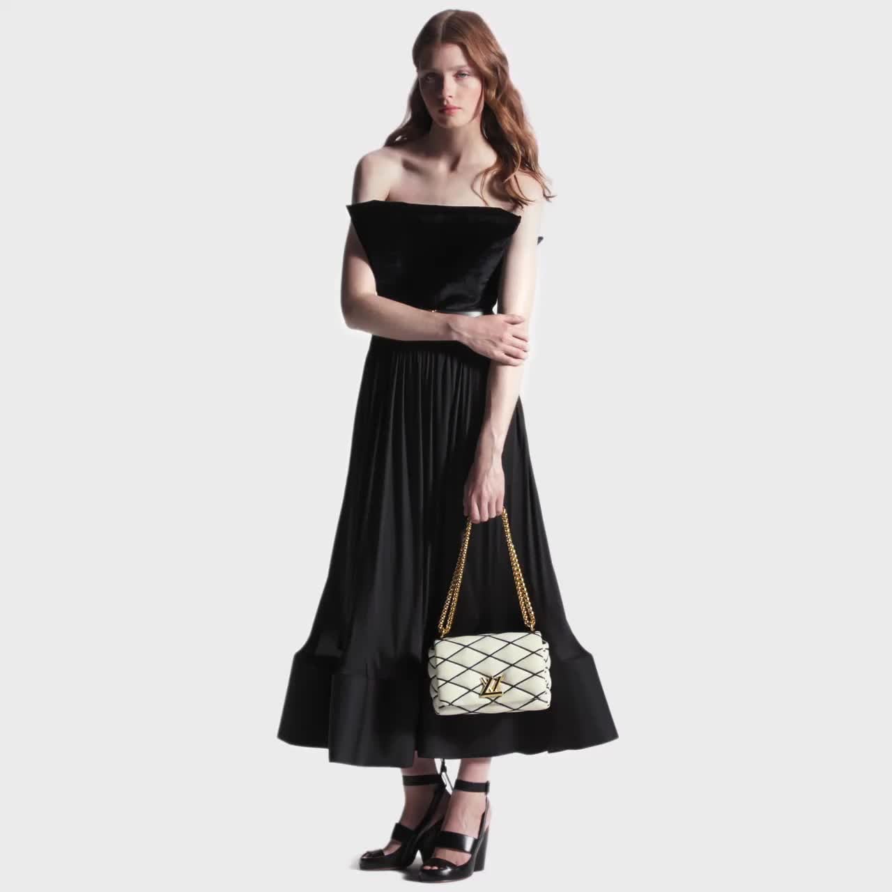 Terbuat dari bahan lambskin halus, tas GO-14 MM ini menghadirkan corak quilt khas koper hard-sided klasik Rumah Mode. Dilengkapi LV Twist lock bernuansa keemasan, tas serbaguna ini dapat dijinjing menggunakan handle bagian atas atau dibawa dengan rantai sliding. Bagian handle dapat disesuaikan menjadi bantalan kulit pada rantai, sehingga terasa nyaman saat dikenakan di bahu atau diselempang.