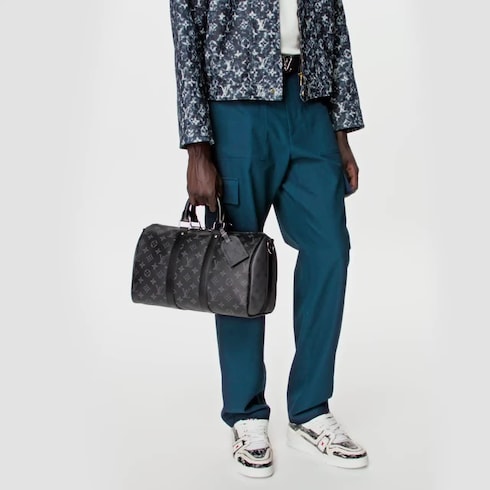 Material Monogram Eclipse coated canvas menghadirkan kemewahan elegan pada tas Keepall Bandoulière 35. Elemen kulit berwarna black pada handle atas dan side band serta hardware bernuansa palladium menonjolkan desainnya yang tak lekang waktu. Dengan tali yang bisa dilepas dan diatur panjangnya, tas ini nyaman untuk dikenakan di bahu.